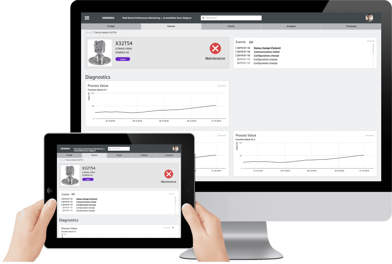 The Field Device Monitoring application helps asset- and service managers of industrial processing plants to monitor the status and health of their devices.