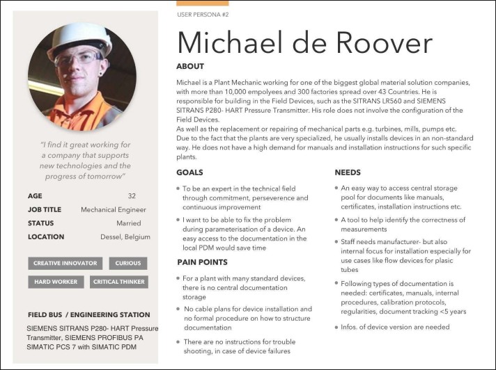 The Field Device Life Cycle Process for Field Devices in Process Industries Standard covers a five-stage process. The main use cases emerged from the experience map opportunities in stage 3. After defining the most important use cases and tasks with the product owner, the design team was able to schedule and conduct remote usability tests with the pilot customers to validate the early stage design concepts.