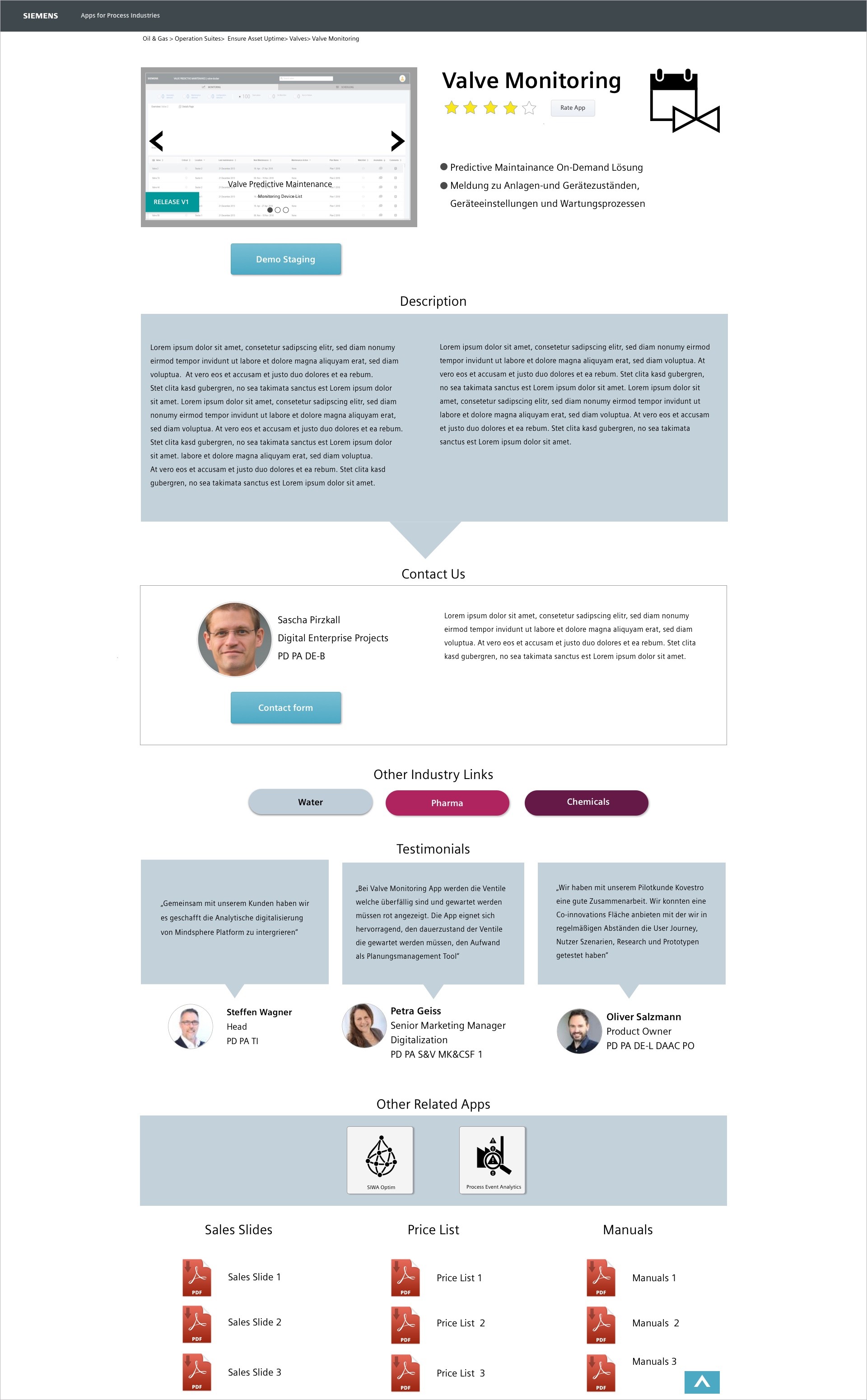 The portal served two main user groups: internal marketing experts and external suppliers from the industrial process industry. While the final product would be accessible to customers via the Siemens MindSphere Store, internal users would access it through the company’s intranet.