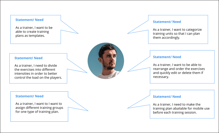 During the first weeks, the teams planned Customer onsite interviews with trainers and video analysts of SoccerTraining clubs. I worked together with the product manager and architects to define the user stories and user flows for the training planner application.