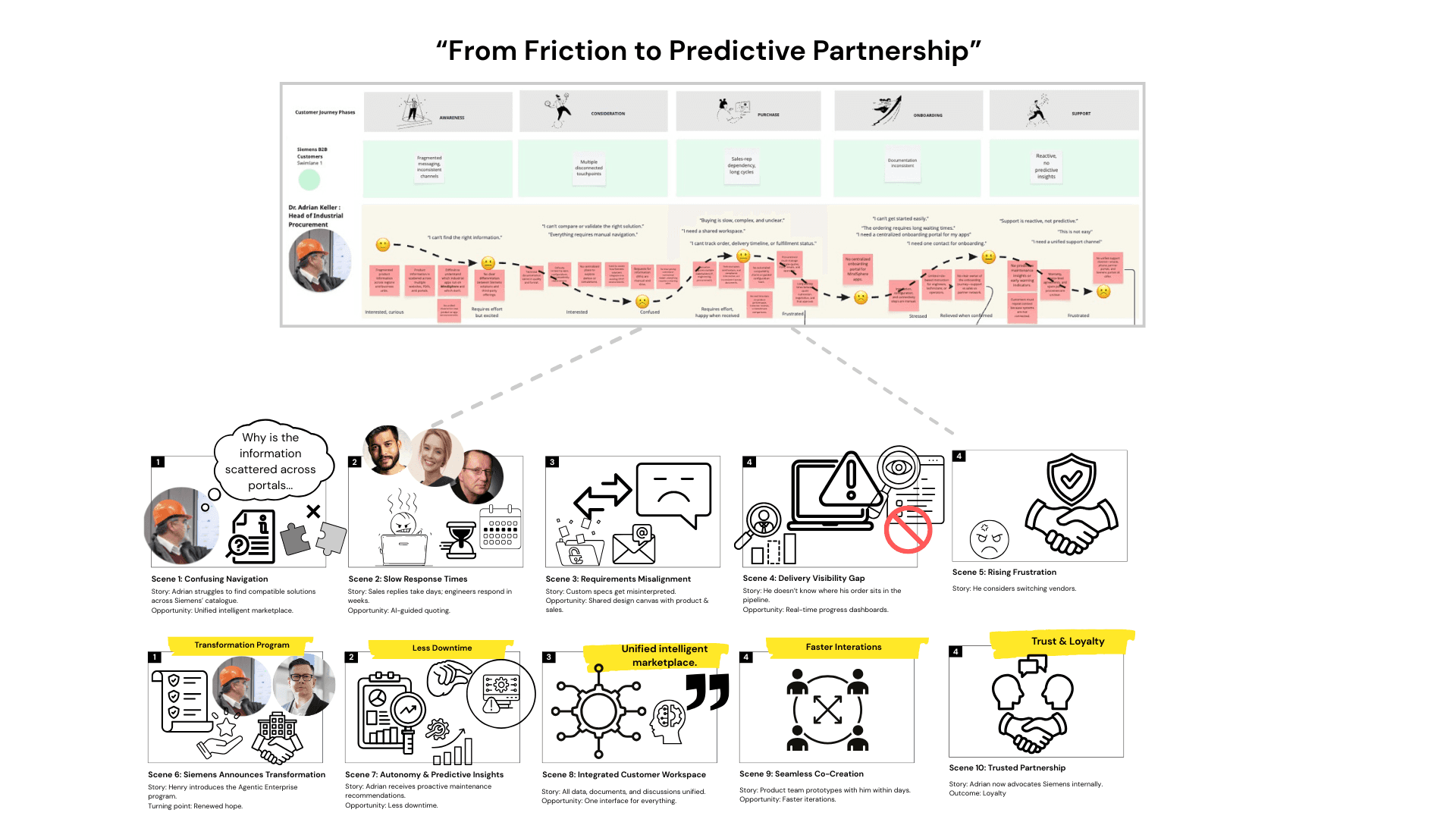 The storyboard scenes link directly to the customer journey stages — across all stakeholders, not only end-customers.