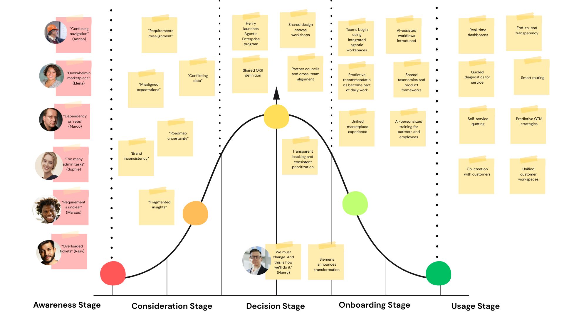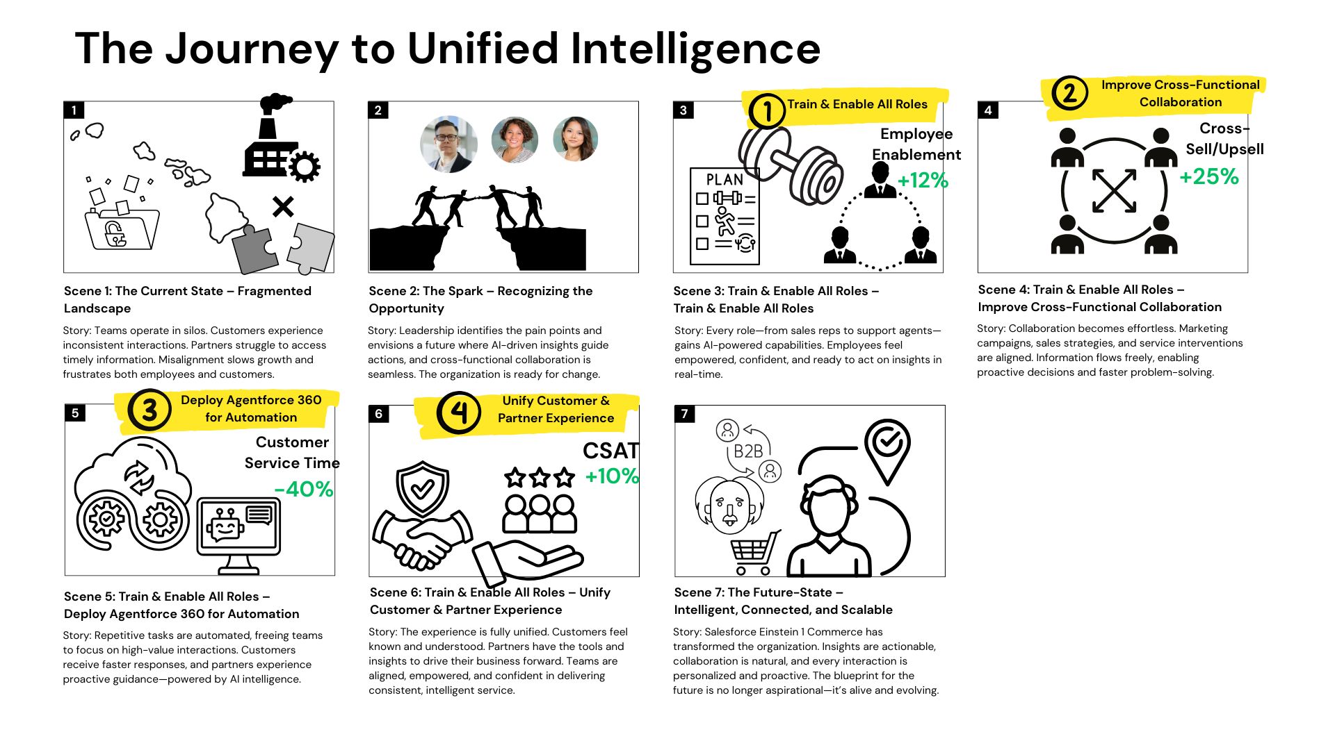 This case study demonstrates how research from The Agentic Enterprise: Connecting Frontstage & Backstage with Agentforce 360 informed a storyboarding approach to organizational change. By visualizing misalignments, mapping stakeholder perspectives, and integrating KPIs, the storyboard became a collaborative, narrative-driven tool that guided the journey from fragmented processes to a unified, AI-powered enterprise.